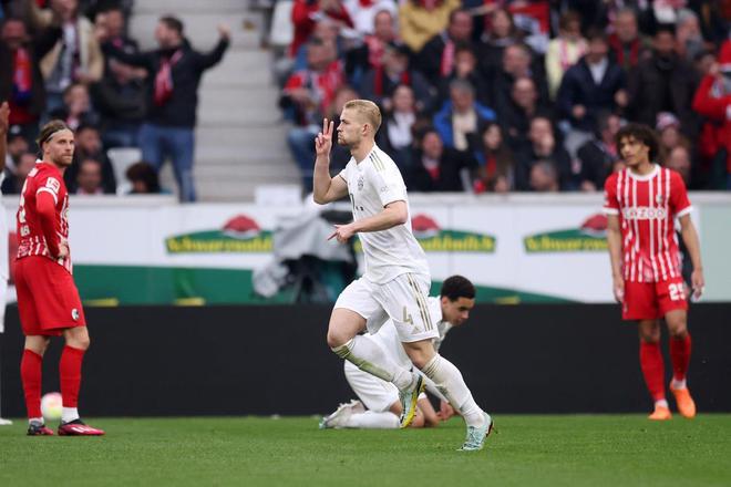 下半场回来,拜仁在51分钟打破僵局:穆夏拉混战当中回敲,德里赫特离门30米外直接起脚,直挂球门右上角,比分来到1-0!身价7500万的德里赫特堪称带刀后卫,本赛季德甲已经打进3球。