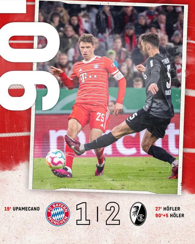 北京时间4月5日凌晨2点45分,2022-23赛季德国杯1/4决赛迎来一场焦点战,拜仁慕尼黑坐镇主场安联球场迎战弗赖堡。上半场,于帕梅卡诺利用角球机会首开纪录,霍夫勒扳平比分;下半场,帕瓦尔击中门框,补时最后时刻,穆西亚拉手球送点,霍勒压哨将点球罚进。最终,拜仁爆冷1-2不敌弗赖堡,被淘汰出德国杯,图赫尔遭遇执教首败。