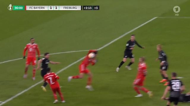 直播吧4月5日讯 德国杯1/4决赛,拜仁vs弗赖堡。第92分钟,拜仁1-2遭弗赖堡反超,穆西亚拉手球送点,霍勒点射破门。