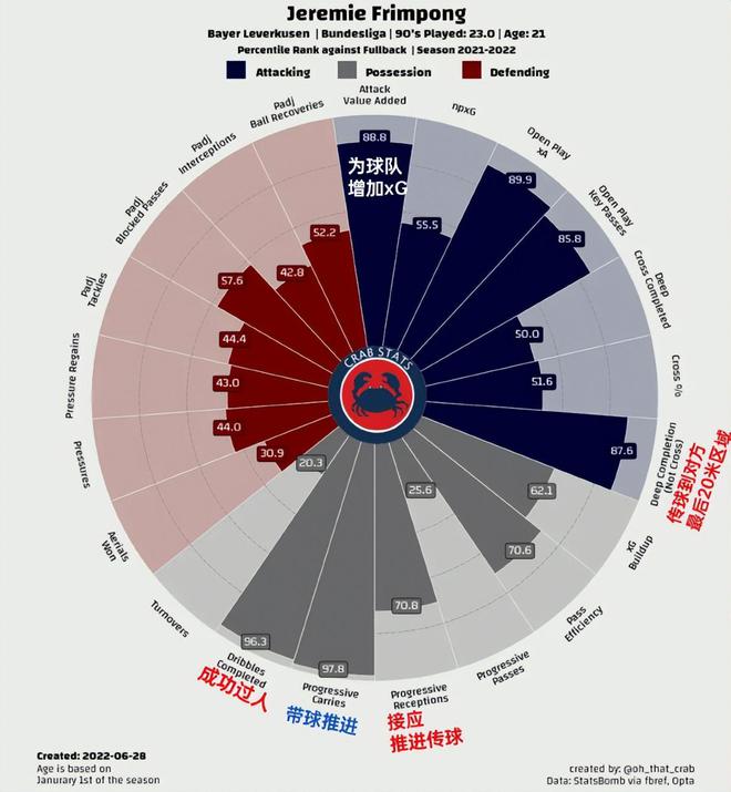 从带球推进、成功过人到为球队增加xG(预期进球)、运动战预期助攻和传球到对方最后20米区域等数据看,弗林蓬在德甲已经是最顶尖的边后卫。