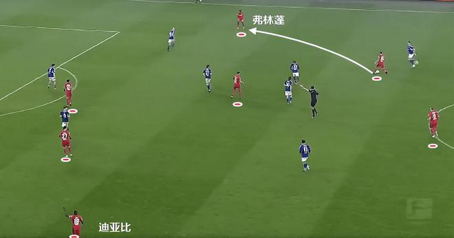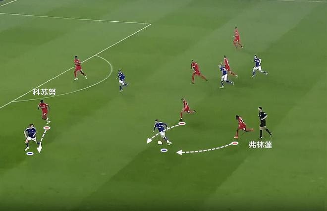 从下图的站位也能看懂,弗林蓬完全就是一个右路攻击手的站位。他跟迪亚比拉开两条边路,都有单兵发起进攻的能力。