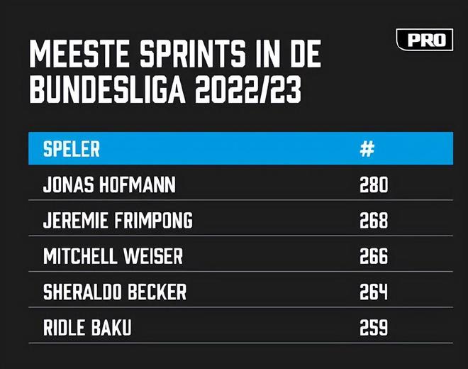 本赛季在德甲,弗林蓬的冲刺次数仅次于霍夫曼,排在所有球员里的第二位。