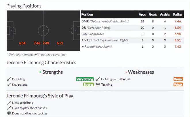 从统计数据看,弗林蓬本赛季在右后卫和右边锋位置的场均打分是最低的,相对更合适出任右边翼卫和右前卫。