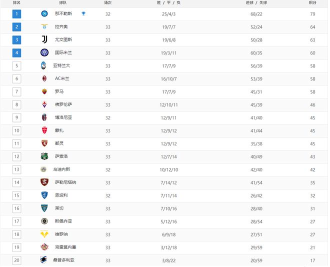 我们来看意甲即时积分榜情况:那不勒斯79分,拉齐奥64分,尤文63分,国米60分,亚特兰大58分,米兰58分,罗马58分,佛罗伦萨46分……