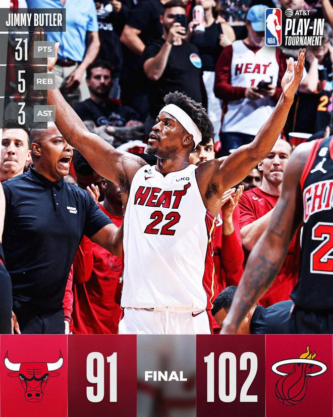 2022-23赛季NBA附加赛继续进行,迈阿密热火队主场获胜晋级季后赛。斯特鲁斯得到31分,巴特勒得到31分,他们率队在第四节关键时刻打出12-1的小高潮确立胜局,热火队在东部最后一场附加赛以102-91战胜芝加哥公牛队。热火队拿到东部第8种子,他们将在季后赛首轮对阵密尔沃基雄鹿队,公牛队遗憾结束赛季。