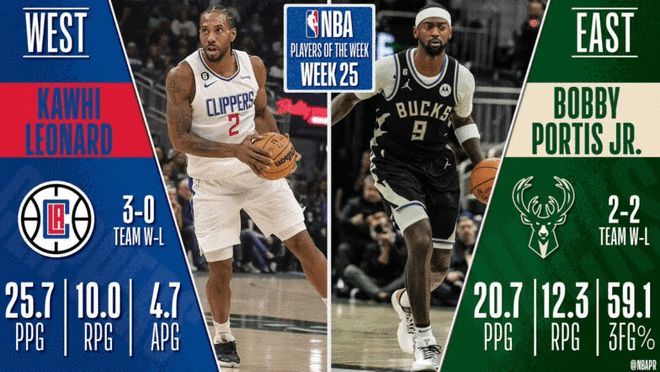 NBA官方宣布,凭借过去一周的出色表现,密尔沃基雄鹿队的波蒂斯和洛杉矶快船队的伦纳德被评为东西部第25周的周最佳球员(当地时间4月3日-9日)。