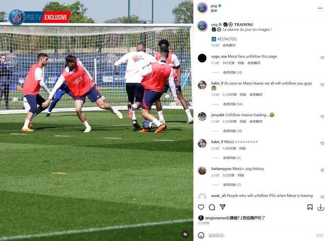 北京时间5月4日,巴黎圣日耳曼俱乐部官方账号更新了球队的最新训练视频。尽管梅西由于被“三停”并没有出现在视频中,但评论区还是有大量梅西粉丝涌入,他们疯狂刷屏留言表示,对大巴黎俱乐部已经彻底脱粉,并且将会取消关注该账号。
