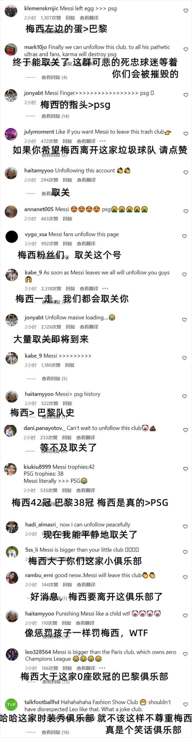 一些梅西粉丝纷纷表示要取关巴黎:“大家都别再关注这个号了!”:“再见吧!梅西一走我们就集体拉黑你!”:“大量取关即将到来,等着吧!”还有球迷嘲讽巴黎毫无底蕴:“这家时装秀俱乐部不该不尊重梅西,真是个笑话!”:“惩罚梅西的方式太孩子气了!”