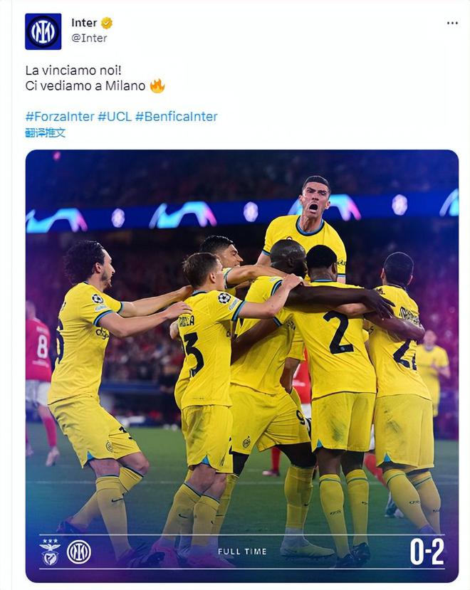 此前,国米在欧冠只有2次在1/4决赛中首回合客场2-0取胜,分别是1964年客场2-0击败贝尔格莱德游击队和1967年客场2-0拿下皇马,最终他们收获1冠1亚。而他们上一次打进欧冠4强还是在09/10赛季,那一年他们在穆里尼奥的带领下夺得了冠军。