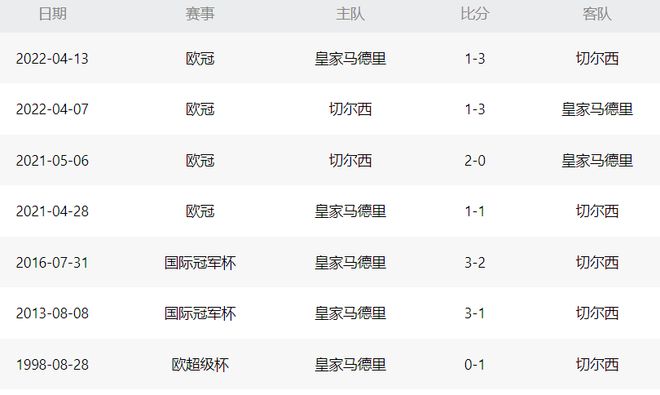 两支球队从1998年到现在,一共交锋过7次,皇马面对切尔西3胜1平3负,两队从历史战绩来看,可谓是平分秋色,不分伯仲。而在欧冠的历史上,两队最近4次交手,皇马1胜1平2负,处于劣势。