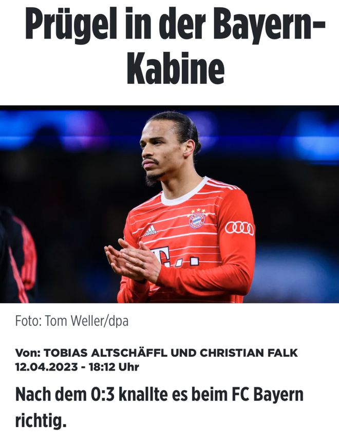 北京时间4月13日凌晨,来自德国权威媒体《图片报》的透露,在欧冠完败曼城赛后,拜仁两位射手马内与萨内爆发激烈冲突,马内赛后甚至在更衣室用拳头击打了萨内的面部。