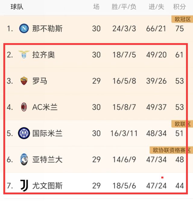 1,由于AC米兰只拿到1分,目前他们依然排名第四,而国米则以2分之差排名第五。看到这个结果,罗马无疑在内心偷笑,本轮他们如果能在主场击败乌迪内斯,就将甩开米兰双雄,哪怕爆冷输给对手,罗马依然排名前四;