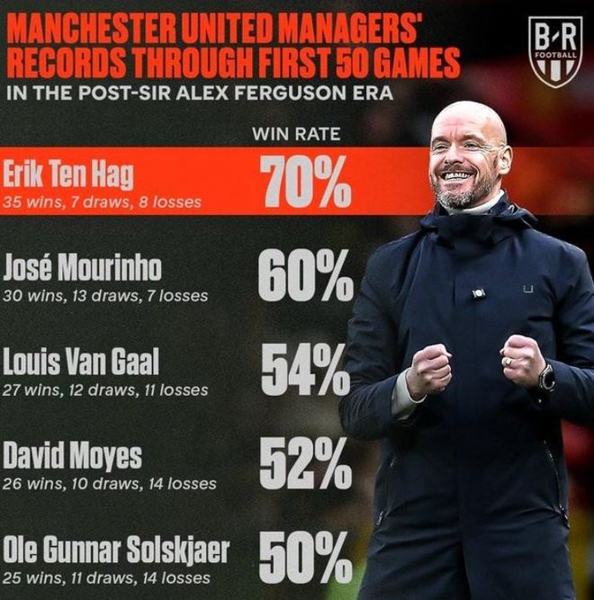 数据显示,在带队2-2战平塞维利亚之后,滕哈格执教曼联的场次,正式抵达50场,而根据《直播吧》的统计数据,荷兰名帅的胜率达到70%,是后弗格森时代,带领曼联前50场比赛胜率最高的,而第二名的穆里尼奥同期的胜率,则只有60%!看起来,滕哈格执教生涯能够夺得8座冠军奖杯,确实有真材实料!