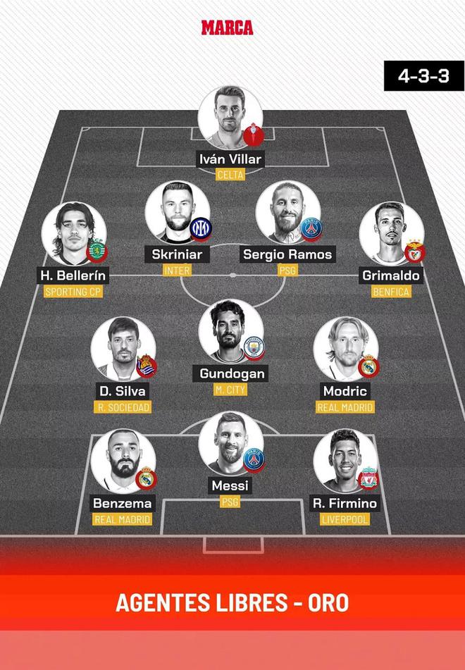 在这套阵容里,包括塞尔塔门将比利亚尔以及贝莱林、什克卡洛尼亚尔、拉莫斯、格里马尔多四名后卫,三名中场是莫德里奇、京多安和大卫-席尔瓦,锋线则是本泽马、梅西、菲尔米诺。
