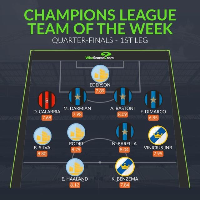 直播吧4月15日讯 wwhoscored统计了本周欧冠最佳阵,国米和曼城各4将入围。