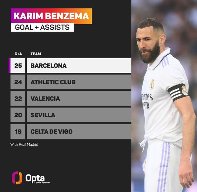 据OPTA统计,本泽马皇马生涯对阵巴萨各项赛事已经取得16球9助攻,后者也成为其皇马生涯参与进球最多的对手。以下为本泽马皇马生涯参与进球(进球+助攻)最多对手榜单:
