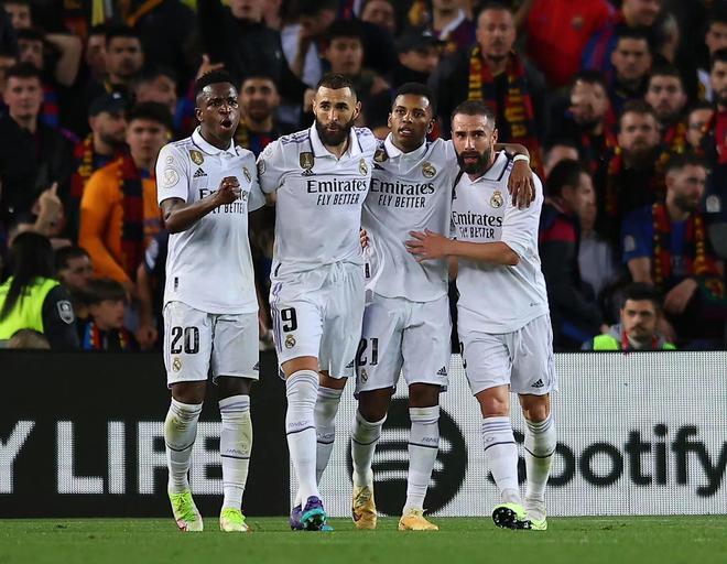 皇马变阵,卡马文加打边后卫,巴尔韦德回撤打中场。其实皇马已经属于是摆开了狂攻阵型,类似于424的全攻打法,就是要破釜沉舟和巴萨殊死一战!这种气势压到了巴萨,维尼修斯在上半场快结束时打进一球,随后下半场本泽马再次予取予夺!1987年出生,已经36岁的法国老将,继续证明自己,一口气上演帽子戏法!