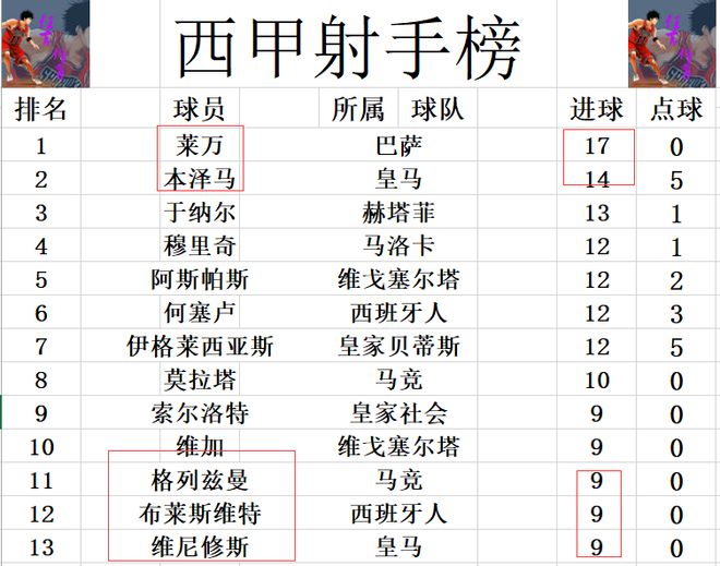 射手榜方面,前十没有变化,莱万17球领跑,本泽马14球位列第2,于纳尔13球排在第3,何塞卢,阿斯帕斯,伊格莱西亚斯,穆里奇12球并列第4。维尼修斯,格列兹曼,布莱斯维特等人则是9球刚好挤入前十。
