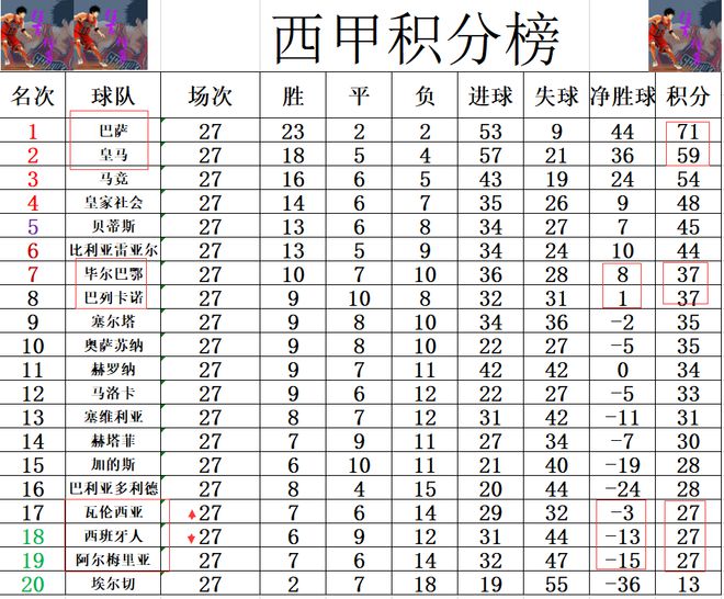 积分榜方面,巴萨12分优势力压皇马领跑,冠军是越来越稳,不过巴萨近来也不省心,西甲主席特瓦斯摆了巴萨一道,巴萨官方发布公告回应“要求西甲主席特瓦斯立刻公开解释,并呼吁他辞去西甲主席的职务。”巴列卡诺今天本有机会回前7,但是3分变1分后,净胜球劣势的他们还是排在毕尔巴鄂之后位列第8。最后抢到1分的瓦伦西亚则是以净胜球优势超过阿尔梅里亚,西班牙人逃出降级区,西班牙人这轮过后真就跌入了降级区。