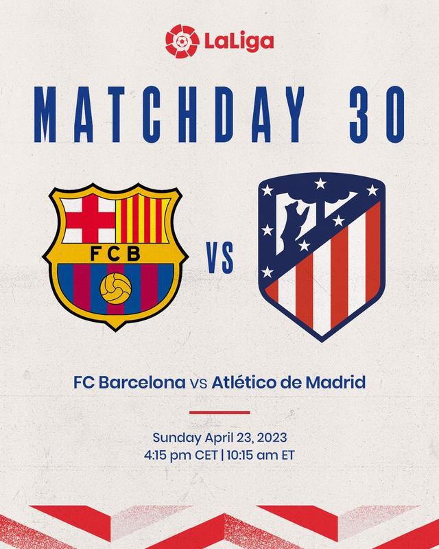 直播吧4月4日讯 据马德里竞技俱乐部官方推特的消息,西甲第30轮联赛马竞与巴萨的比赛时间确定,将在北京时间4月23日22:15进行。