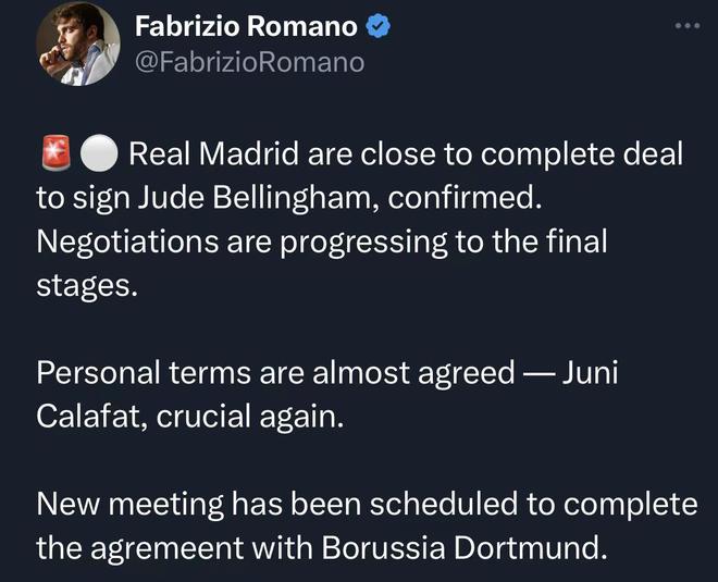 稍早前,多家媒体以及名记相继证实,皇马即将签下大英头号新星贝林厄姆。罗马诺表示,皇马已经接近完成签下贝林厄姆的交易,这一消息已经得到确认,谈判已经进入了最后阶段。目前球员的个人条款已经基本达成一致,朱尼-卡拉法特(皇马头号球探)再次发挥了至关重要的作用。皇马已经和多特蒙德安排了新的会面,来完成本次交易。