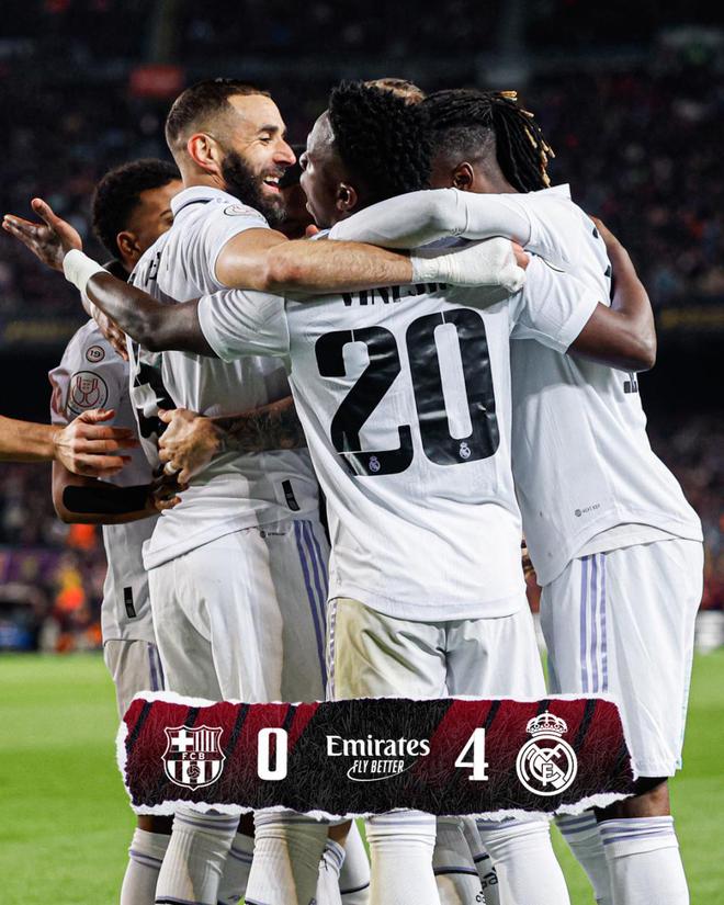 此番诺坎普再战,皇马终于扬眉吐气了一回!威尼修斯在伤停补时阶段打入了自己在国家德比的处子球,本泽马下半场上演帽子戏法,最终取得4-0大捷,以4-1的总比分进入国王杯决赛。