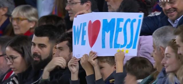 直播吧4月11日讯 西甲第28轮,巴塞罗那主场迎战赫罗纳,比赛第10分钟,诺坎普现场的球迷都高喊梅西名字,还有球迷举起了写有我们爱梅西字样的标语。