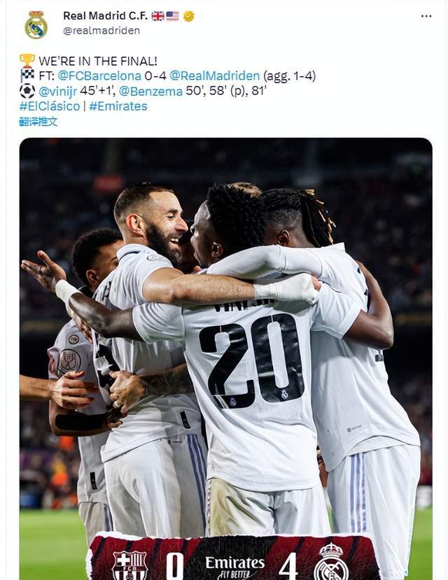 上半场,本泽马助攻维尼修斯首开纪录;下半场本泽马30分钟戴帽,最终皇马客场4-0血洗巴萨,以总比分4-1翻盘晋级决赛,对手将会是奥萨苏纳。