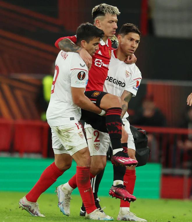 利马在无人对抗下按着自己的脚跟倒地不起,塞维利亚的蒙铁尔和阿库尼亚迫不及待地将他抬出场外,这除了因为他俩是阿根廷同胞之外,更因为客队看到了扳平甚至反超的希望。当时曼联已经用完5个换人名额,只能10人应战。利马被担架抬回了更衣室,他恐怕将跟拉什福德一样长期缺阵。