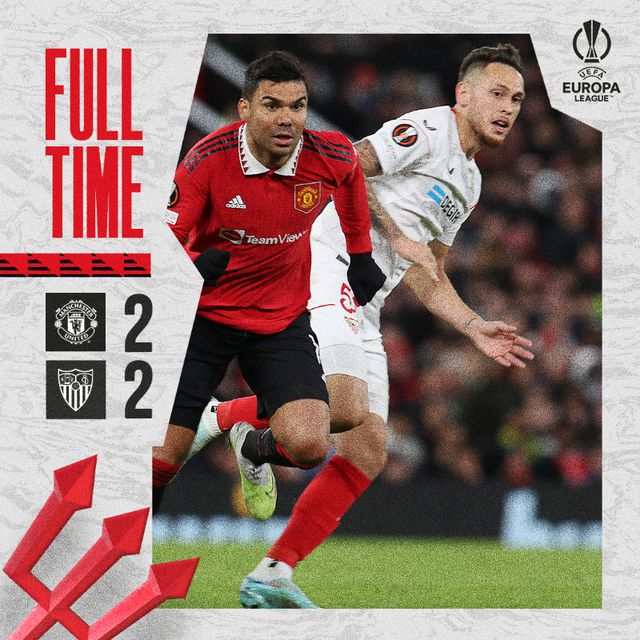 最终,全场比赛结束,曼联主场2-2战平塞维利亚。