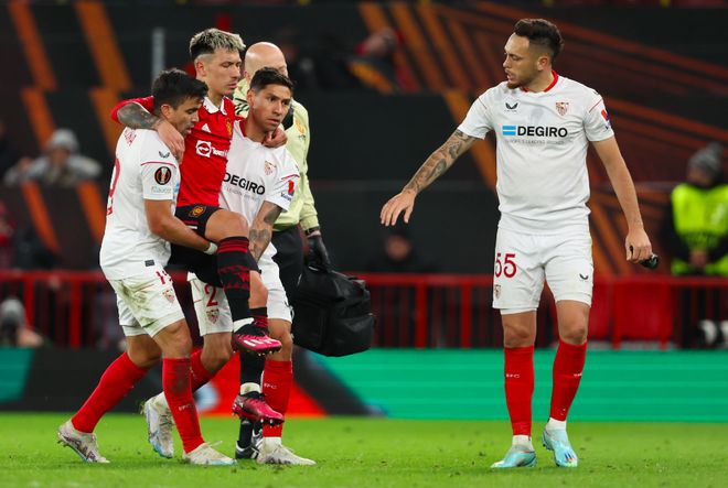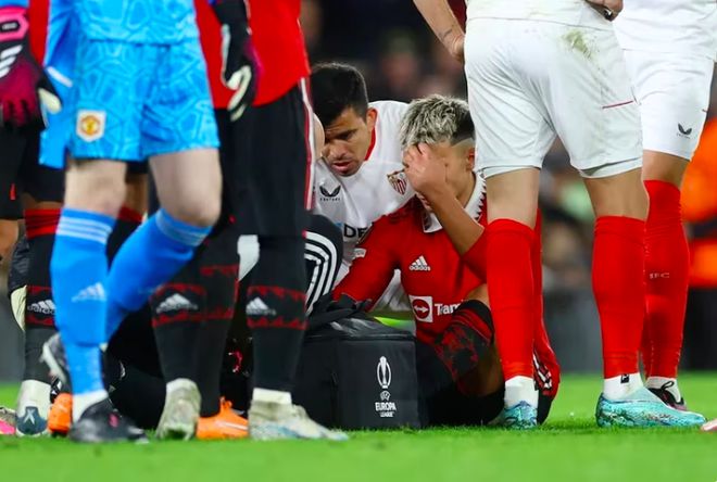 塞维利亚的两名阿根廷队友蒙铁尔和阿库尼亚将他抬下了场,这一幕也成为了经典画面。