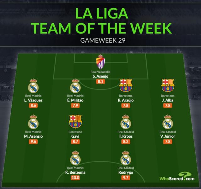 直播吧4月4日讯 本轮西甲已经结束全部争夺,皇马、巴萨都分别收获大胜,其中本泽马更是上演7分钟帽子戏法的好戏。数据网站Whoscored也评选出本轮西甲最佳阵容,其中本泽马满分领衔,皇马共7人入选,巴萨也有三将在列。以下为具体阵容: