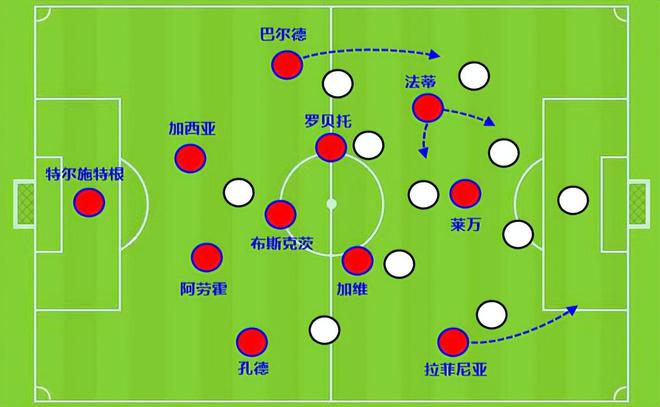 与赫罗纳的这场比赛,巴萨回到433阵型。进攻端法蒂的表现还是可圈可点,在肋部有一些接应和串联,带来了机会。