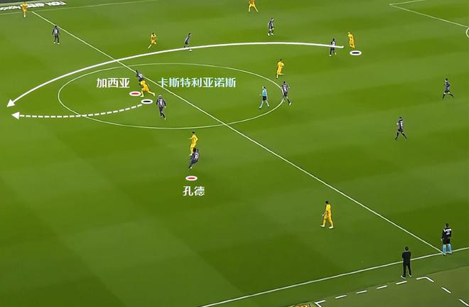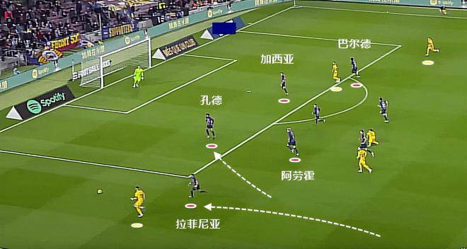 阿劳霍顶出去之后,孔德怕对方前插背后,所以有一个走内线的移动。不过加维的跟防,断绝了这种可能性。