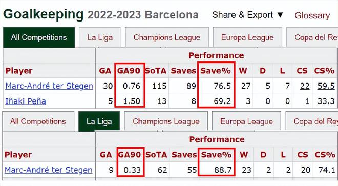 本赛季巴萨在28场西甲的丢球只有9个,但是在欧冠、欧联杯、西班牙国王杯和西超杯上,15场比赛丢球数高达26个。