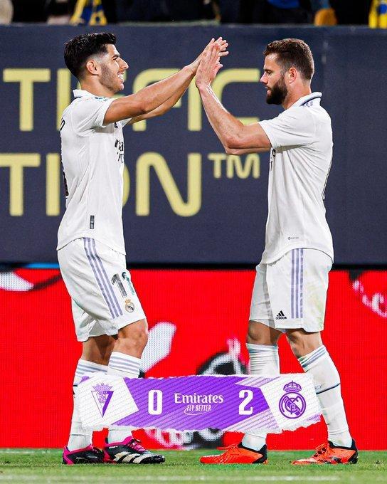 北京时间2023年04月16日03:00,加的斯在西甲迎战皇马。上半场双方互有攻势,埃斯皮诺劲射中柱,本泽马补射击中横梁。加的斯门将大卫-吉尔发挥出色高接抵挡力保球门不失。易边再战,皇马大举进攻形成压制,罗德里戈门前错失良机,本泽马抽射中柱。久攻不下之际,纳乔平地起惊雷禁区前起脚远射直入右下死角打破僵局。随后巴尔韦德助攻阿森西奥推射破门扩大领先优势。最终,皇马客场2-0战胜加的斯。