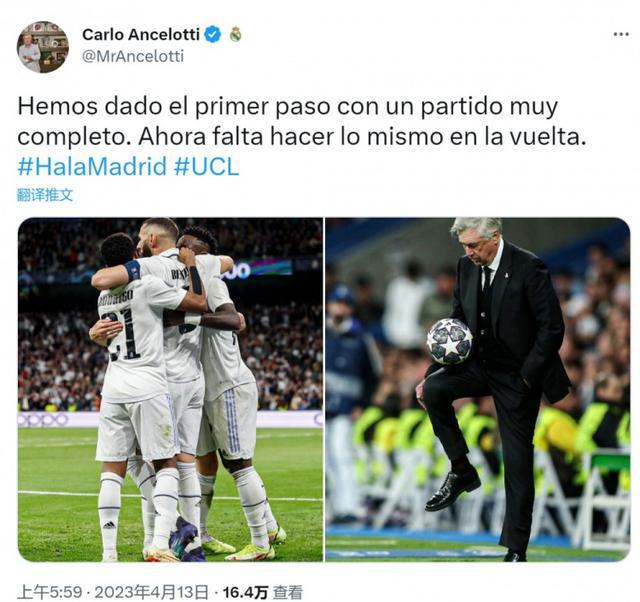 皇马主帅安切洛蒂在社交媒体上晒出比赛照片,鼓励球队再接再厉,他写道:“我们以一场非常完美的比赛迈出了第一步,现在需要在次回合比赛中同样做到这一点。”