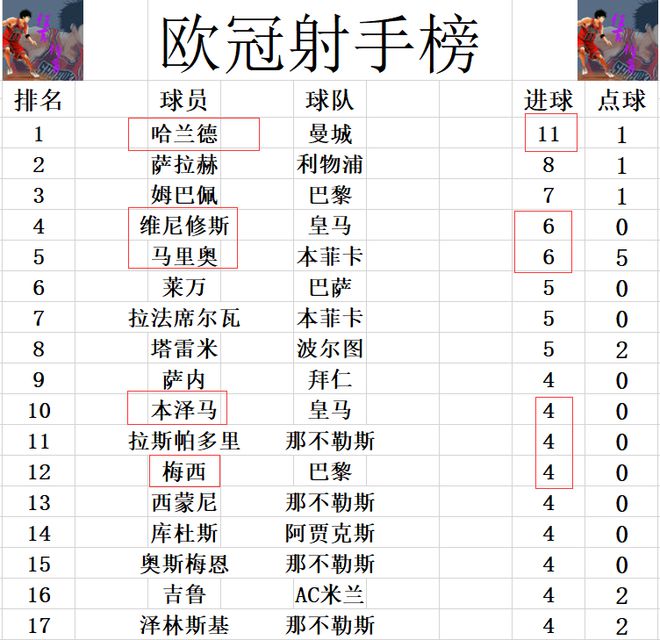 射手榜方面,哈兰德11球领跑,维尼修斯今天送出2次助攻,但是没有进球,还是和马里奥6球并列第4,哈兰德还是有5球的优势。本泽马今天又进球,近3场连续破门打入4球,追上了梅西,萨内等人4球挤入前十。皇马和曼城首回合都赢了球占得先机,两队或许会连续两年在半决赛相遇,去年皇马三叉戟发挥出色险胜曼城,本赛季维尼修斯,本泽马和哈兰德竞争射手王就是一大看点了。