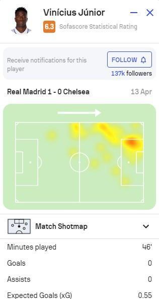 SofaScore为维尼修斯上半场打出6.3分的评价。