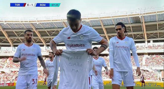 开场仅6分钟,扎莱夫斯基右路推进,禁区前沿起脚劲射,打在舒尔斯的手上,裁判果断示意点球,VAR也确认了判罚。迪巴拉操刀命中,连续两轮罚入点球,罗马1-0打破僵局。进球之后,迪巴拉跑到场边,拿出早已准备好的球衣,将进球献给过生日的妈妈。