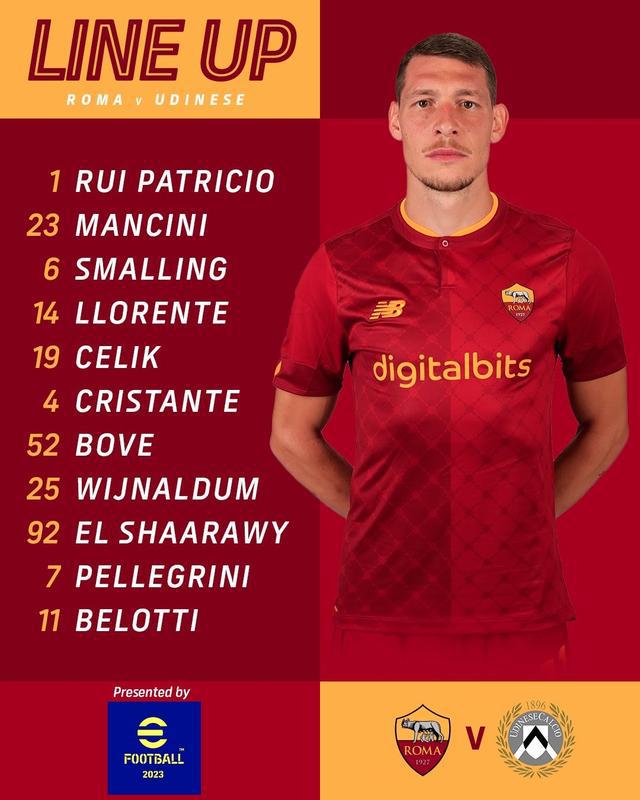 罗马首发:1-帕特里西奥、23-G-曼奇尼、6-斯莫林、14-迭戈-略伦特、19-切利克、4-克里斯坦特、52-博沃、25-维纳尔杜姆、92-沙拉维、7-佩莱格里尼、11-贝洛蒂