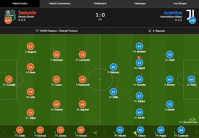 此后,双方均无法再次改写比分,最终尤文客场0-1不敌萨索洛。