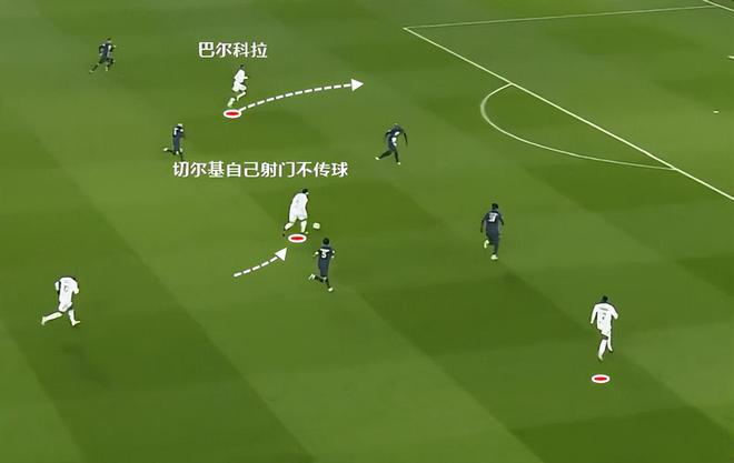 二次拿球后观察中路队友,横传找切尔基非常漂亮。如果不是切尔基和登贝莱之间出现配合失误,这一波反击可以打出很大的威胁。