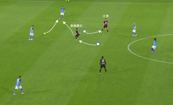 本纳塞尔的后腰前置打法同样抓住了那不勒斯的命门。本4的站位非常靠前,甚至有时要站在吉鲁的身前,目的就是为了替代36岁的老大哥实施前场高位逼抢。他对位盯防身体灵活的洛博特卡要比糙哥克鲁尼奇来得轻松,很好地限制住了这名中场核心的发挥。