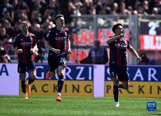 4月15日,博洛尼亚队球员桑索内(右)进球后庆祝。