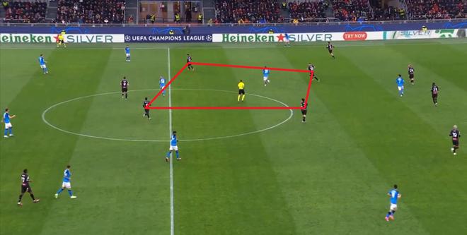克鲁尼奇是单后腰,托纳利和迪亚斯分居身前的两侧,本纳赛尔则出现在前腰的位置上,其中三人要卡住泽林斯基、安古伊萨和洛博特卡的活动区域,迪亚斯则在边路帮助卡拉布里亚,防守由克瓦拉茨赫利亚带动的左路进攻。