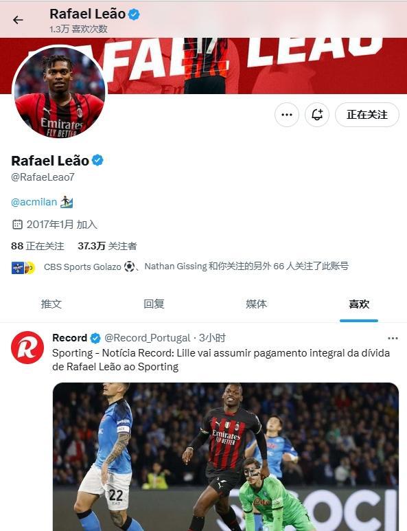 据社媒显示,在《纪录报》推特转发了这篇报道后,莱奥本人在这条消息下面直接点赞。