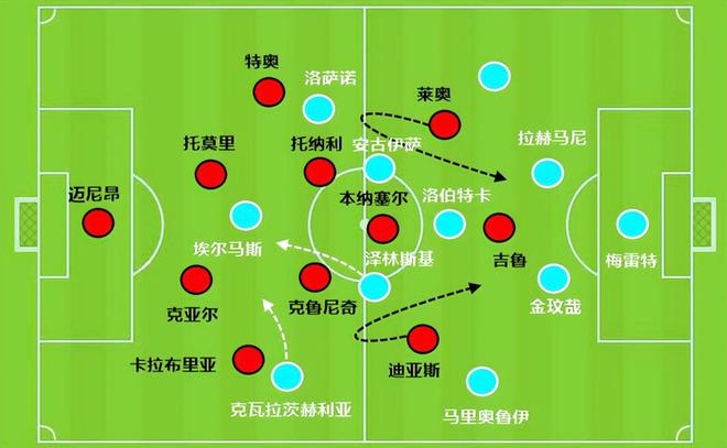 那不勒斯的压迫打法很激进,皮奥利让莱奥和迪亚斯在中场的两个肋部找起速推进反击的机会,显然是找准了斯帕莱蒂的战术软肋。