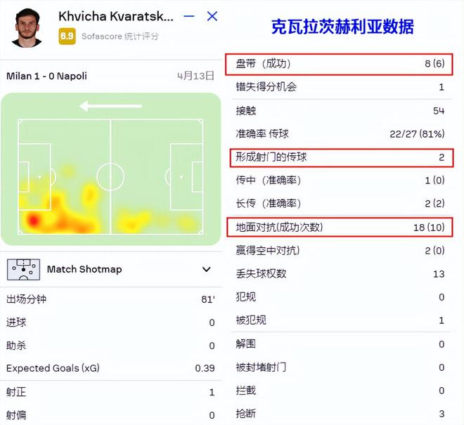 后者本场的一对一对抗效率其实很高,8次过人成功6次。关键是AC米兰有较好的协防,同时克瓦拉茨赫利亚过人之后,并没有太多直接攻击禁区的选择与机会,也让后续的补救工作变得容易许多。