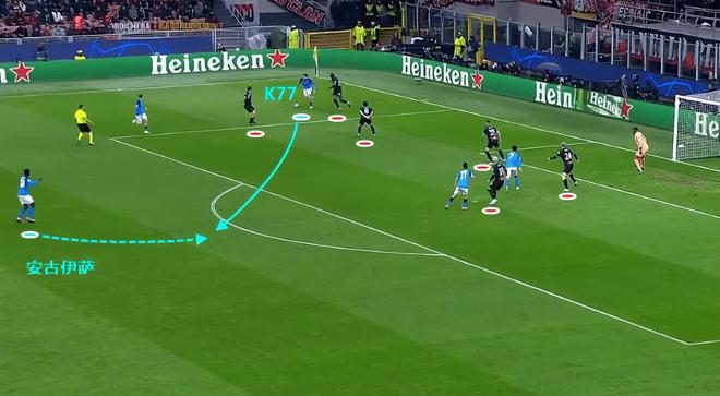 当克瓦拉茨赫利亚在侧翼强势拿球,吸引多人防守后,AC米兰的禁区正面是有点空的。这一次安古伊萨跟进射门,是一次不错的机会,可惜没能打好。